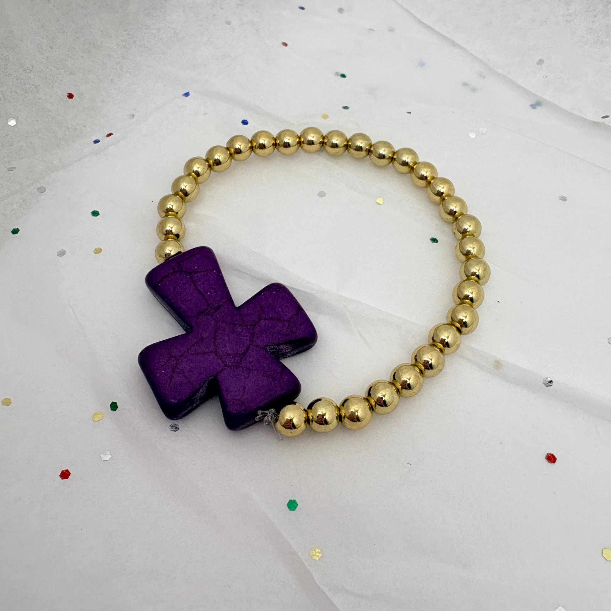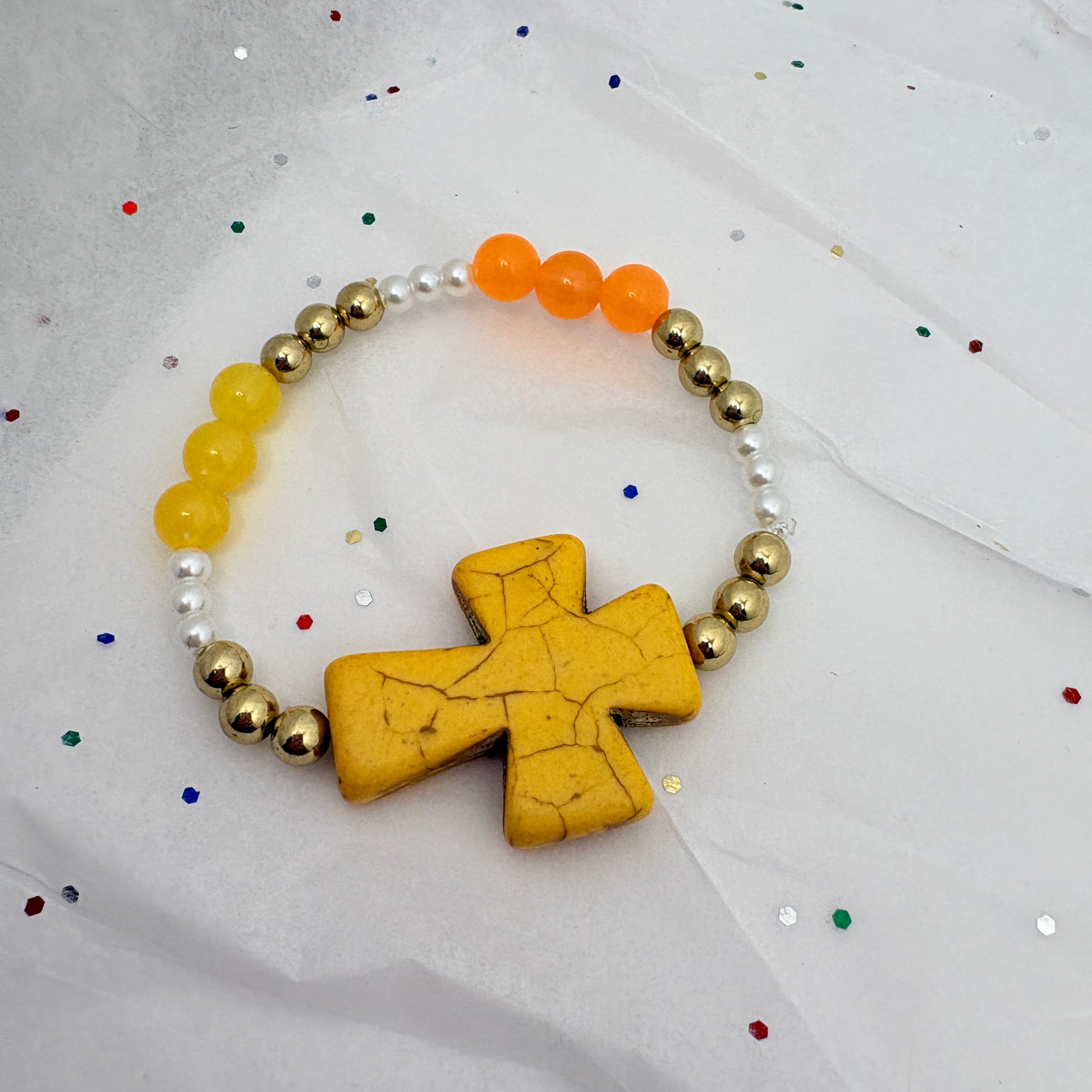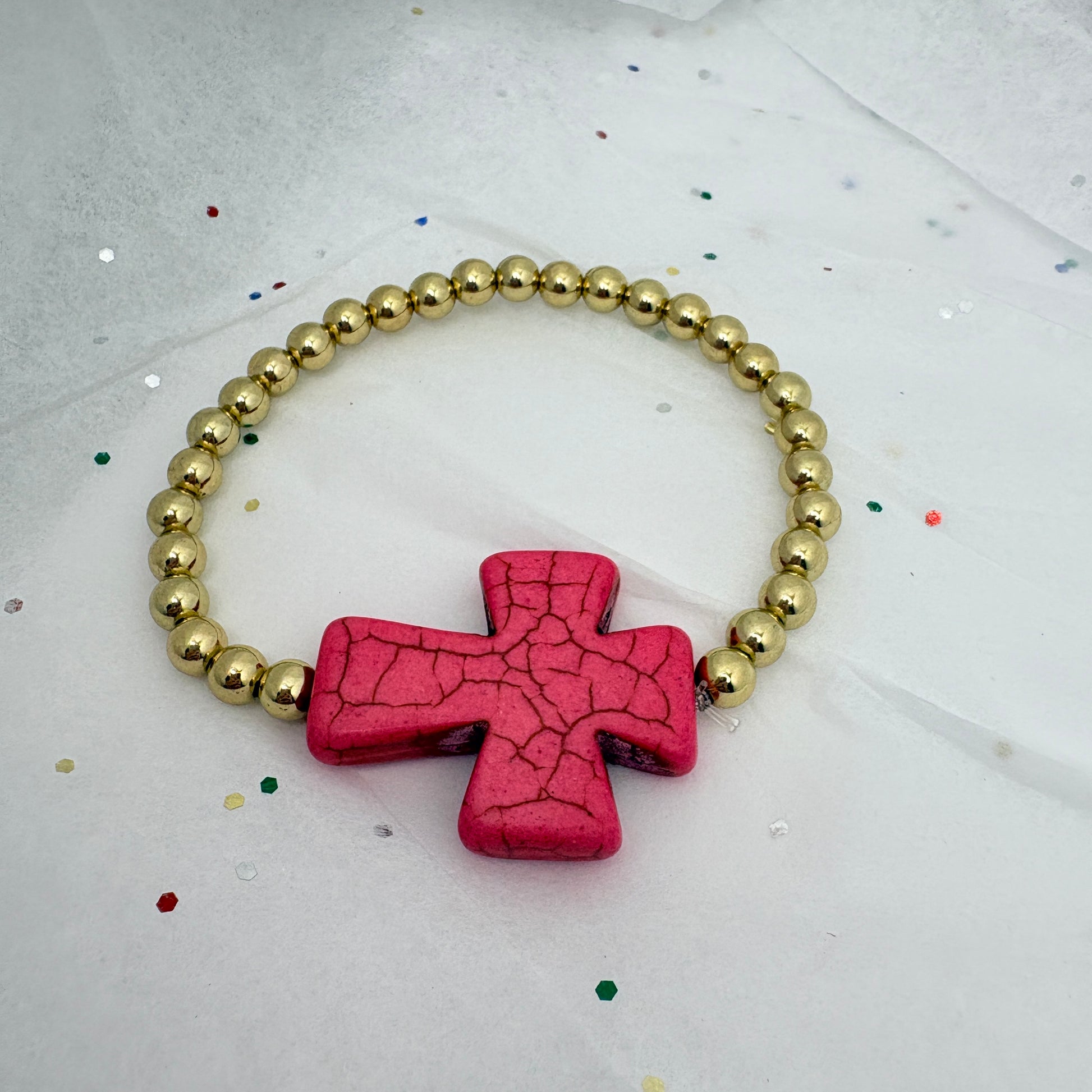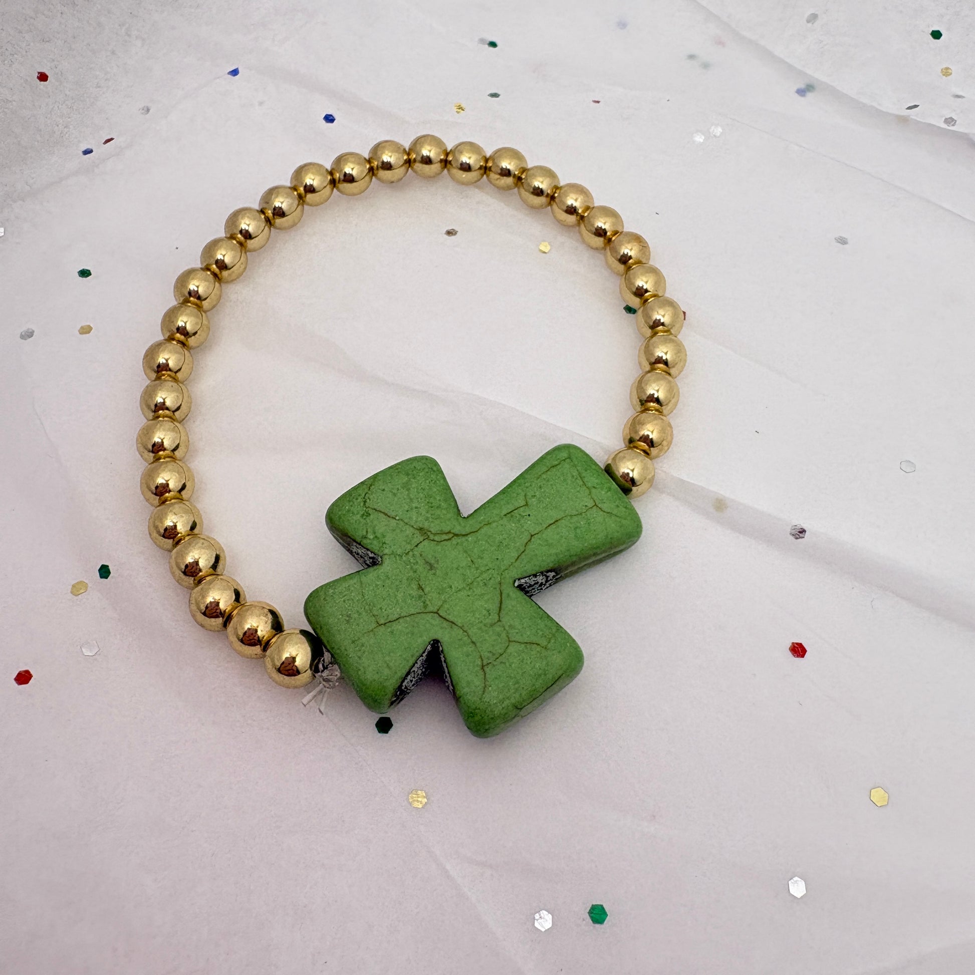 Pulseras hechas a mano con cuencas doradas y cruces de piedra natural.