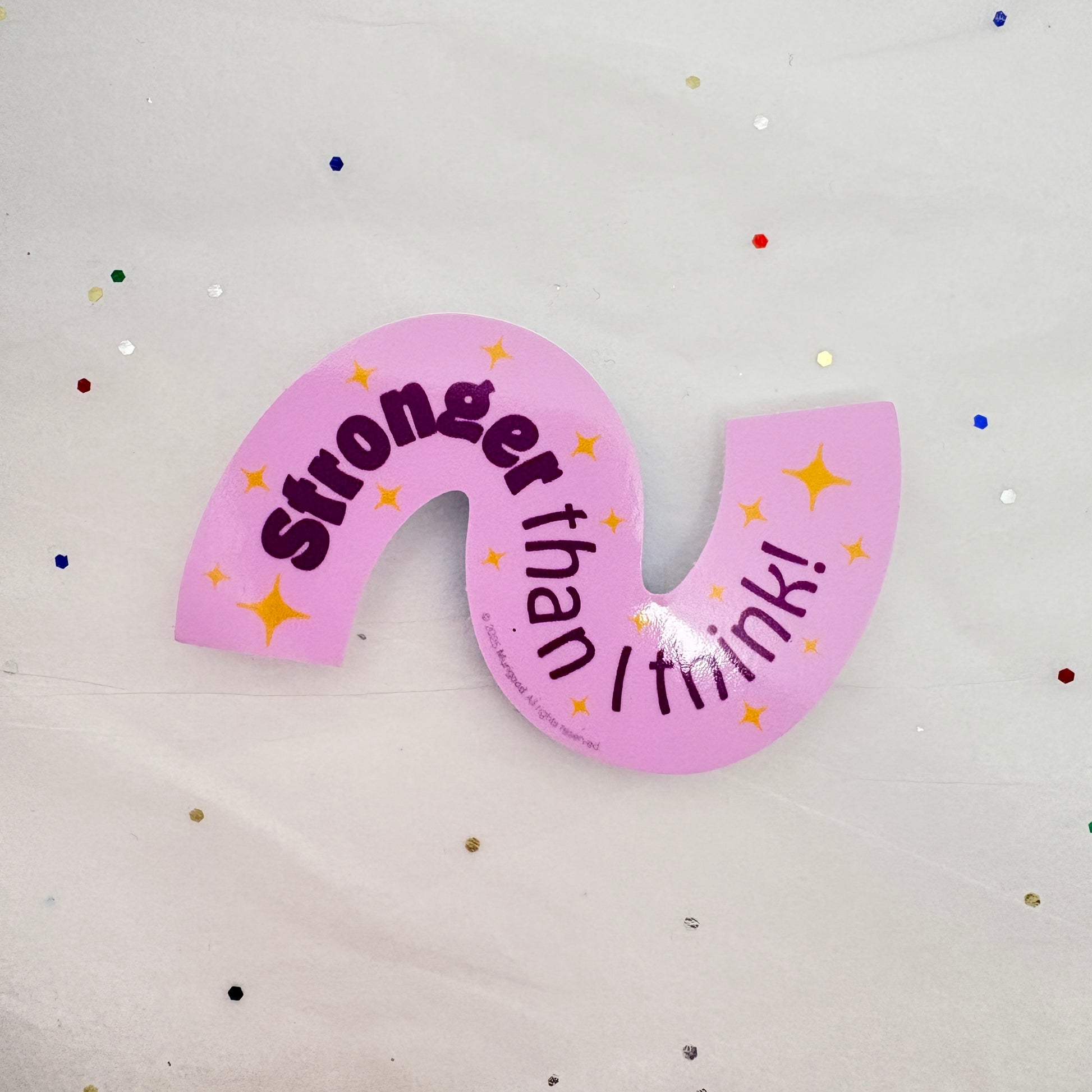 Sticker de vinilo de 3 pulgadas con el mensaje 'Stronger than I think!. Este sticker te recuerda que tu fuerza siempre ha estado ahí, incluso cuando dudas de ti misma. Es un mensaje para esos días difíciles en los que necesitas reconocer tu resiliencia y todo lo que ya has superado. Perfecto para tu libreta, laptop o botella.